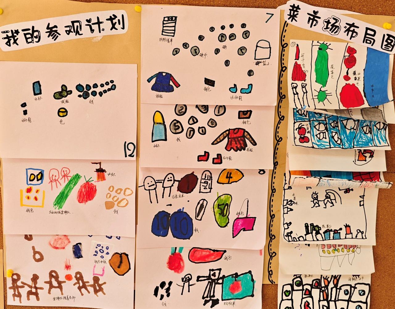 紧接着,“我的参观计划”“绘制菜市场布局图”“制定购物清单”等环节有序开展。孩子们化身小小规划师,用画笔勾勒出心中的菜市场模样,认真写下想要购买的食材,一笔一划间满是对实践活动的期待。